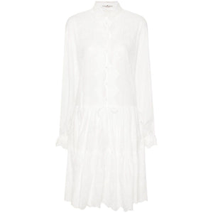 off-white cotton floral embroidery scallop collar long sleeves elasticated cuffs fabric-covered buttons drawstring waist ruffled panels internal logo tag thigh-length front button placket Embroidered shirt dress Size and Fit - This piece fits true to size. We recommend you get your regular size. Model is 1,75m / 5ft 8in wearing size 40 (IT)