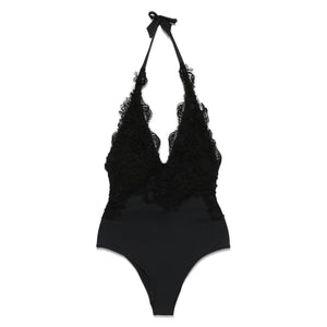 black halterneck tie fastening rear tie fastening V-neck Be mindful to try on swimwear over your own garments. Lace detail swimsuit Size and Fit - This piece fits true to size. We recommend you get your regular size. Model is 1,75m / 5ft 8in wearing size 1 (NUM)
