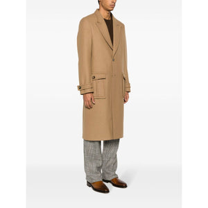 beige wool blend peak lapels front button fastening two button-fastening pockets two side slit pockets long sleeves belted cuffs signature Pegaso motif logo patch to the rear martingale to the rear central rear vent internal jetted pocket internal logo patch logo-jacquard lining straight hem Wool coat Size and Fit - This piece fits true to size. We recommend you get your regular size. Model is 1,84m / 6ft 1in wearing size 48 (IT)