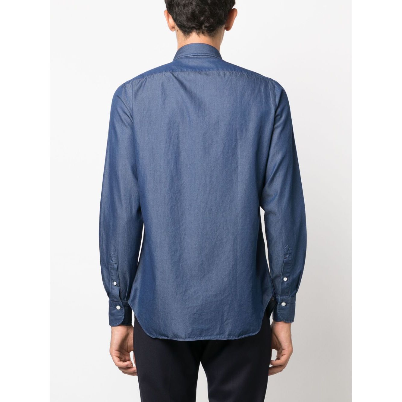 long-sleeve denim shirt from FINAMORE 1925 NAPOLI featuring navy blue, cotton, spread collar, front button fastening, long sleeves, buttoned cuffs and rear curved hem. Regular fit denim shirt Size and Fit - This piece fits true to size. We recommend you get your regular size. Model is 1,84m / 6ft 1in wearing size 39 (COLLAR CM)