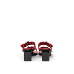 In red leather, two bands with metal studs with a patent effect, closed with buckles, round toe, red leather detail on the toe. Flat heel in shiny black
