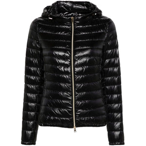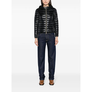 black feather down padded design quilted gold-tone logo plaque logo-engraved gold-tone hardware detachable drawstring hood front two-way zip fastening long sleeves elasticated cuffs two side zip-fastening pockets elasticated hem quilted lining Nylon short down jacket Size and Fit - This piece fits true to size. We recommend you get your regular size. Model is 1,75m / 5ft 8in wearing size 40 (IT)