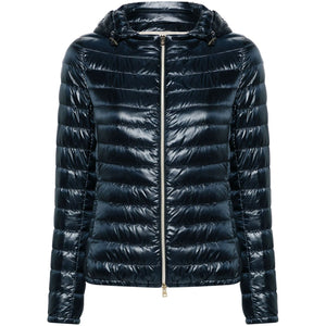 navy blue feather down padded design quilted gold-tone logo plaque logo-engraved gold-tone hardware detachable drawstring hood front two-way zip fastening long sleeves elasticated cuffs two side zip-fastening pockets elasticated hem quilted lining Nylon short down jacket Size and Fit - This piece fits true to size. We recommend you get your regular size. Model is 1,75m / 5ft 8in wearing size 40 (IT)