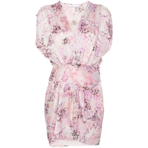 ecru/light pink silk all-over floral print V-neck cap sleeves fitted waistline ruched detailing asymmetric hem concealed side zip fastening Floral print silk short dress Size and Fit - This piece fits true to size. We recommend you get your regular size. Model is 1,75m / 5ft 8in wearing size 36 (FR)