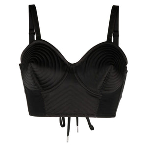 Jean-Paul Gaultier e Lotta Volkova condividono un debole per i design eccentrici, quindi è naturale che questo reggiseno trapuntato della loro collaborazione trasmetta lo stesso credo. Realizzato in raso setoso e rivestito in jersey, presenta un retro con lacci e coppe a cono che richiamano i codici della lingerie vintage anni '50. Nero, trapuntato, spalline sottili, forma conica, chiusura posteriore con laccio, orlo dritto. Conical corset cropped top Size and Fit - This piece fits true to size. We recommend you get your regular size. Model is 1,75m / 5ft 8in wearing size 36 (FR)