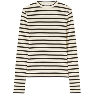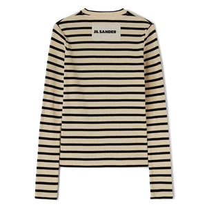 stripe-print cotton T-shirt from JIL SANDER featuring off-white, black, cotton, fine ribbed, horizontal stripe pattern, crew neck, long sleeves, logo patch to the rear and straight hem. Striped cotton t-shirt Size and Fit - This piece fits true to size. We recommend you get your regular size. Model is 1,75m / 5ft 8in wearing size S