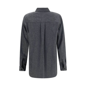 The Auryn Shirt by Khaite combines clean lines with refined materials for effortless elegance. Crafted from dark grey melange wool, it features a front button closure that enhances its understated sophistication. A versatile piece, ideal for elevating both casual and refined outfits.