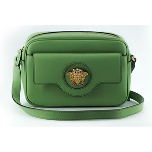 Step out in style with this stunning mint green Versace Camera Case Shoulder Bag, perfect for adding a splash of color to your outfit. Crafted from luxurious calf leather and accented with gold-tone metal hardware, this bag combines fashion with functionality. It features a secure zip closure, a neatly organized main compartment with an interior pocket, as well as an external pocket with a chic flap top closure. Pair it with any ensemble for an instant upgrade to your look. The removable and adjustable leather strap offers versatile carrying options, making it ideal for shoulder or crossbody wear.