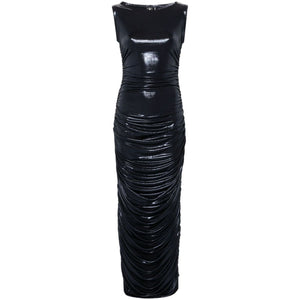 navy blue stretch-design glossy finish slash neck sleeveless ankle-length ankle-length Shirred long dress Size and Fit - This piece fits true to size. We recommend you get your regular size. Model is 1,75m / 5ft 8in wearing size S