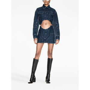 cut-out motorcycle denim jacket from OFF-WHITE featuring blue, cotton, washed denim, cut-out detailing, spread collar, concealed front button fastening, two front flap pockets, long sleeves, straight hem and cropped. Cropped denim jacket Size and Fit - This piece fits true to size. We recommend you get your regular size. Model is 1,75m / 5ft 8in wearing size 40 (IT)