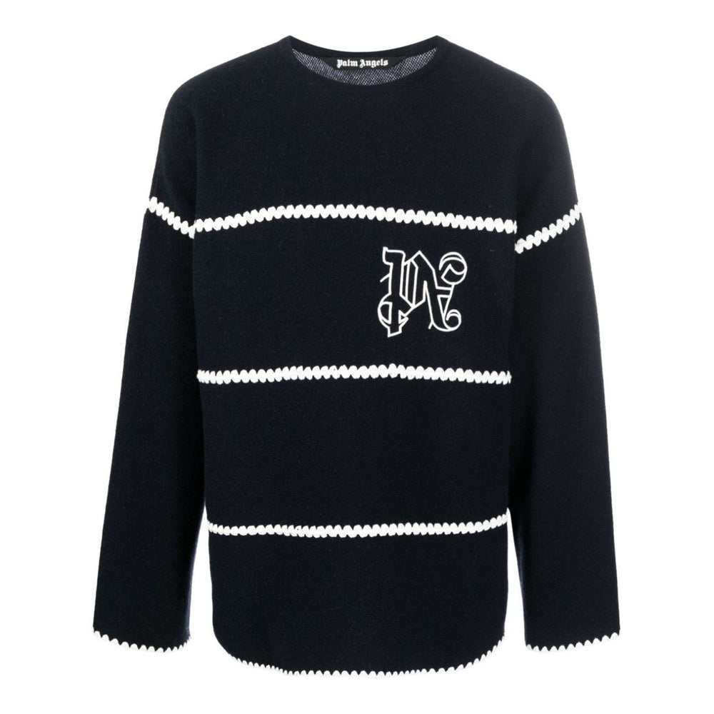 embroidered-monogram striped jumper from PALM ANGELS featuring navy blue, wool blend, knitted construction, horizontal stripe pattern, contrasting trim, embroidered logo at the chest, crew neck, long sleeves and straight hem. Monogram wool sweater Size and Fit - This piece fits true to size. We recommend you get your regular size. Model is 1,84m / 6ft 1in wearing size M