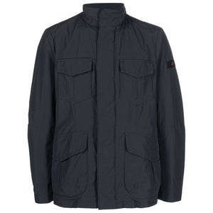 flap-pocket cotton-blend jacket from PEUTEREY featuring logo patch at the sleeve, concealed front fastening, long sleeves, four front flap pockets, navy blue, cotton blend and stand-up collar. Metal blouson jacket Size and Fit - This piece fits true to size. We recommend you get your regular size. Model is 1,84m / 6ft 1in wearing size M