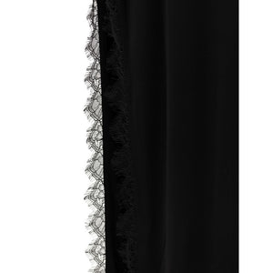 Rosemary Retrofête Black Satin Evening Dress. Long dress with lace details on the sides, two long slits on the sides embellished with lace details, high turtleneck that leaves the shoulders bare, closure on the back with covered zip.