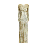 Self-Portrait’s Gold thread long Dress is made of gold fil coupé, which gives the garment a refined, incandescent glow. The design features an open back with an asymmetrical cut, a side slit skirt, and a figure-flattering gathered bodice. The side zipper closure completes this elegant and seductive look.