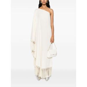 ivory white crepe texture kaftan silhouette one-shoulder fringed edge mid-length unlined Arno fringed long dress Size and Fit - This piece fits true to size. We recommend you get your regular size. Model is 1,75m / 5ft 8in wearing size 40 (IT)