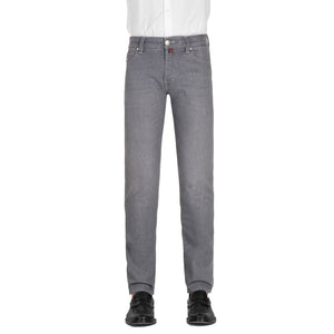 Elevate your denim collection with the distinguished touch of Tramarossa. These exquisite gray jeans blend traditional tailoring with a modern edge, crafted from premium cotton with a hint of elastane for comfort. The white stitching accentuates their refined cut, and the plush gray suede patch featuring a metal logo adds an emblem of luxury to your everyday style. Made in Italy, these are not just jeans; they’re a statement.