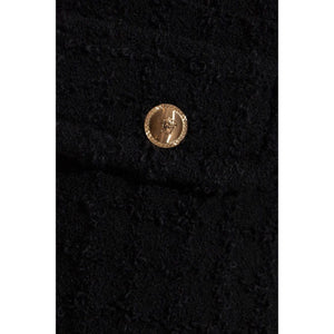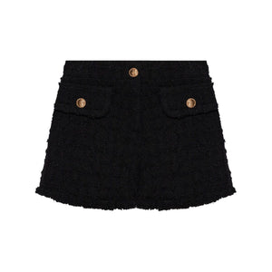 black virgin wool blend tweed decorative button flap two side inset pockets embossed gold-tone buttons unlined concealed fly and button fastening thigh-length Bouclé tweed shorts Size and Fit - This piece fits true to size. We recommend you get your regular size. Model is 1,75m / 5ft 8in wearing size 40 (IT)
