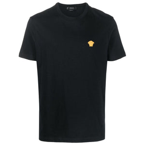 Medusa-embroidered cotton T-shirt from Versace featuring black, cotton, Medusa Head motif, crew neck, short sleeves and straight hem. Logo cotton t-shirt Size and Fit - This piece fits true to size. We recommend you get your regular size. Model is 1,84m / 6ft 1in wearing size M