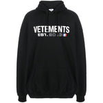 logo-print hoodie from VETEMENTS featuring black/white, cotton blend, logo print to the front, drop shoulder, drawstring hood, front pouch pocket, long sleeves, straight hem and ribbed cuffs and hem. Logo cotton hoodie Size and Fit - This piece fits true to size. We recommend you get your regular size. Model is 1,84m / 6ft 1in wearing size M