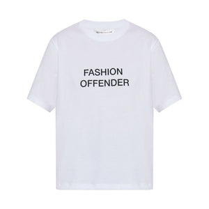 white organic cotton jersey texture slogan print to the front crew neck short sleeves embroidered logo to the rear straight hem This item is made from at least 50% organic materials. Learn more about what makes a product Conscious on our Conscious Criteria page Fashion Offender cotton t-shirt Size and Fit - This piece fits true to size. We recommend you get your regular size. Model is 1,75m / 5ft 8in wearing size S