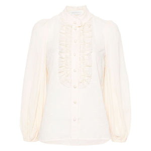 cream white cotton mock neck ruffled detailing polka dot embroidery long sleeves front buckle fastening elasticated cuffs straight hem Cotton blouse Size and Fit - This piece fits true to size. We recommend you get your regular size. Model is 1,75m / 5ft 8in wearing size 1 (NUM)
