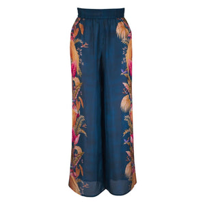 deep blue elasticated waistband drawstring detail vivid floral design side seam pockets lightweight fabric Ascension silk trousers