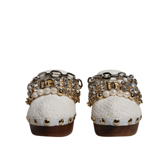 Dolce & Gabbana White Raffia Clogs Bejeweled Chain Sandals Shoes