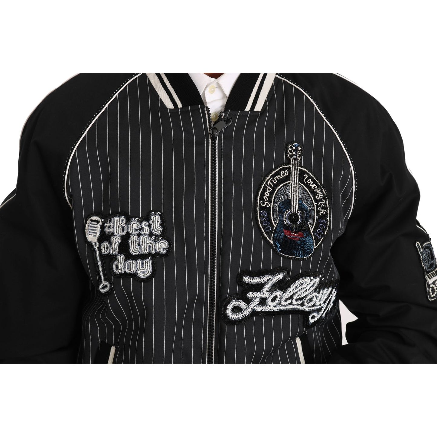 这款令人惊艳的 Dolce & Gabbana 飞行员夹克完美融合了奢华与前卫设计,让您尽显精致风格。这款夹克饰有亮片和串珠贴花,以条纹图案的别致黑色背景为背景,闪闪发光。全拉链开合、两个前袋和两个内袋兼具实用性和时尚感。无可挑剔的徽标细节为品牌增添了独特的标志性风格,而优质材料成分确保了卓越的贴合度和舒适度。这款意大利制造的单品一定会让您成为众人瞩目的焦点,让您的衣橱更上一层楼。